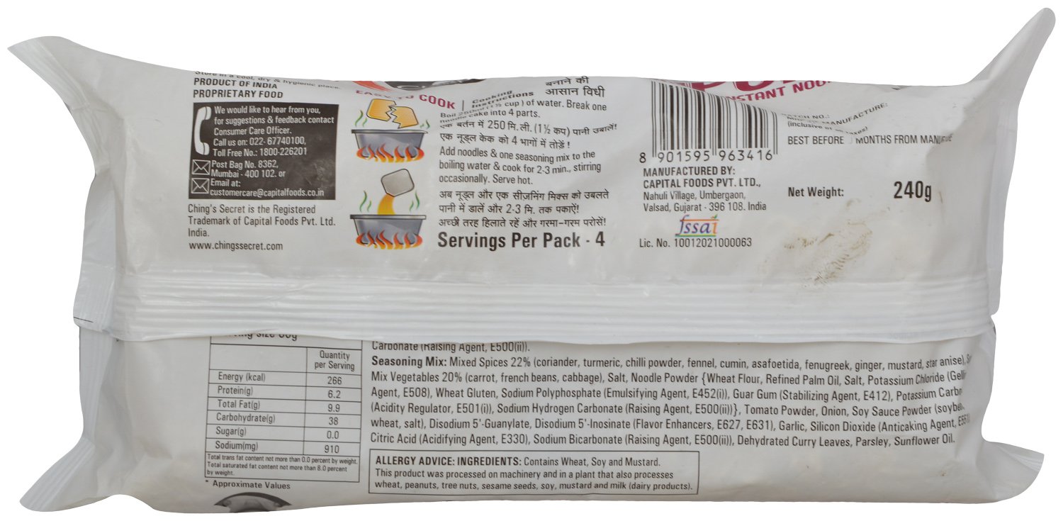 Refined Wheat Flour, Edible Vegetable Oil (Palm Oil), Starch, Iodized Salt, Sugar, Curry Powder, Dehydrated Vegetables (Onion, Garlic, Ginger), Soy Sauce Powder, Spices & Condiments (Turmeric, Cumin, Coriander, Chili, Pepper), Hydrolyzed Vegetable Protein, Acidity Regulators (INS 330, INS 451), Anticaking Agent (INS 551), and Flavour Enhancers (INS 627, INS 631).